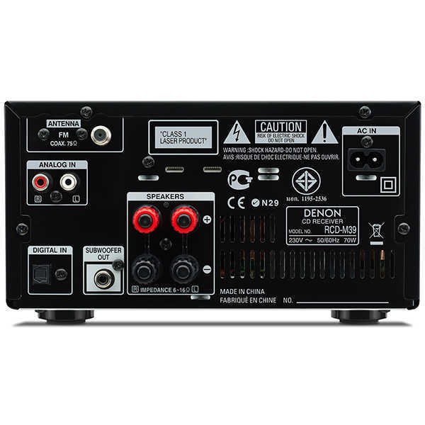 Тюнер Denon RCD-M39 работает в диапазонах AM и FM, и имеет память на 40 настроек. Встроенный усилитель ресивера развивает выходную мощность 2 х 30 Вт, и имеют сильноточные выходные каскады. Кроме того, оптимизированная схема подключения АС обеспечивает очень динамичное и насыщенное звучание при использовании ресивера совместно с акустическими системами Denon SC-M39. Аппарат оснащен качественным цифро-аналоговым преобразователем с параметрами 24 бита/192 кГц, и имеет цифровой оптический вход. Также в Denon RCD-M39 имеет линейный аналоговый вход, и выход для подключения активного сабвуфера. На передней панели располагается разъем mini-jack для стереонаушников.